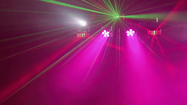 Projects syncronized beams of light around the walls, ceilings & floor, with constantly changing colours, shapes & movement